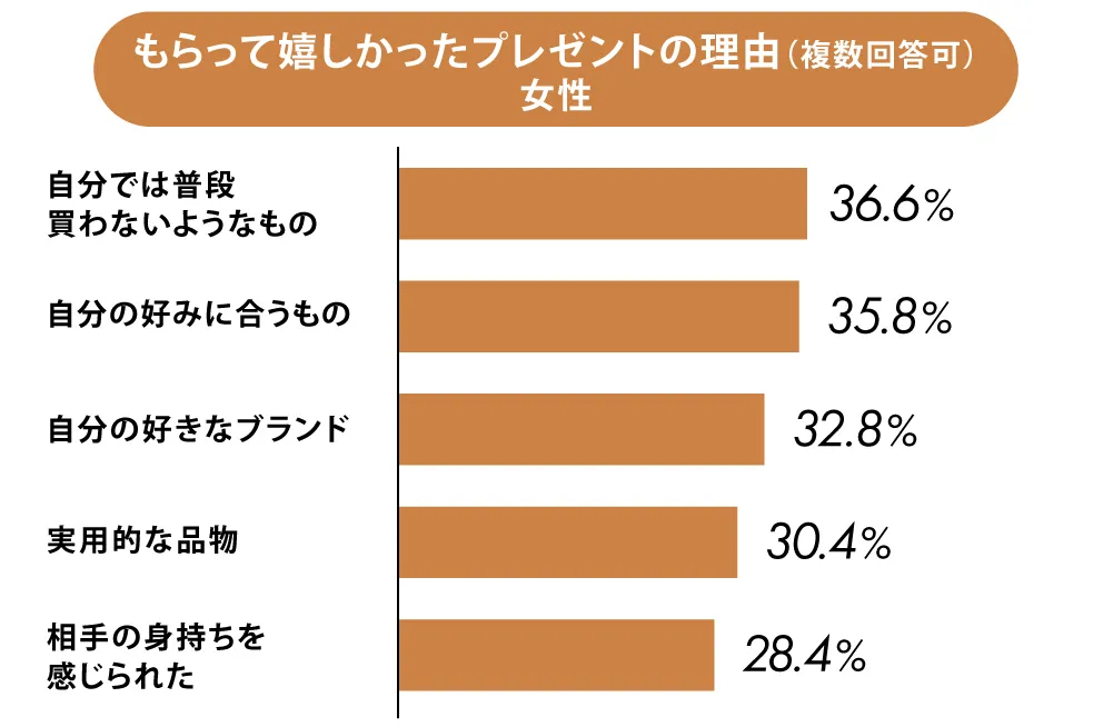 男性では「自分では普段買わないようなもの」が40.8%で最も多く、次いで「自分の好みに合うもの」(37.8%)、「実用的な品物」(35.6%)が高い割合となりました。女性でも「自分では普段買わないようなもの」が36.6%でトップとなり、以下「自分の好みに合うもの」(35.8%)、「自分の好きなブランド」(32.8%)、「実用的な品物」(30.4%)、「相手の気持ちを感じられた」(28.4%)の順で続いています。つまり男女とも、「自分では買わないような特別感のあるもの」や「自分の好みや実用性に合ったもの」が贈り物として喜ばれやすい傾向がうかがえます。