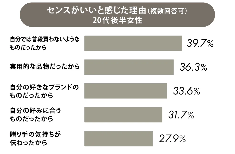 次いで「実用的な品物だった」(36.3%)、「自分の好きなブランドだった」(33.6%)と続き、センスのよさと使いやすさが両立したギフトが高く評価される傾向がうかがえます。