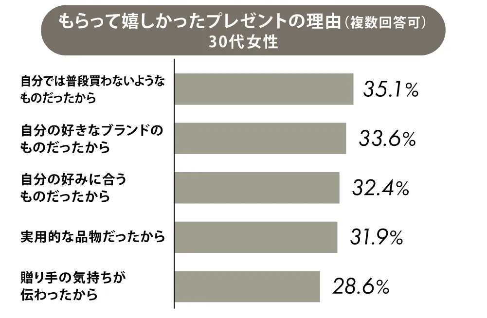 「好きなブランドを覚えていてくれた」という小さな驚き。その気づきが、物の価値以上にうれしさを運んでくれるようです。30代になると好みがはっきりしてくるぶん、ピンポイントで当ててもらえた喜びはひとしお。 - ・自分の好みに合うものだった(32.4%)