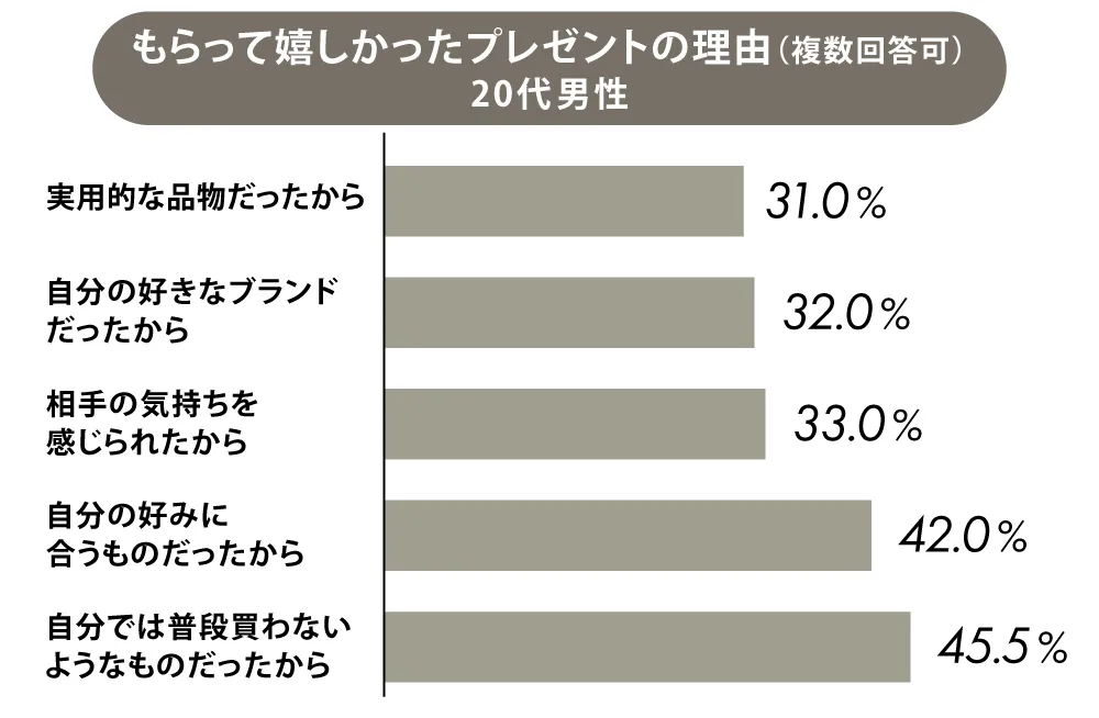 HYACCAが2026年に実施した独自アンケートでは、「自分では普段買わないようなものだったから」(45.5%)が20代男性の1位でした。