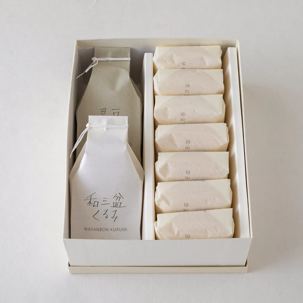 つぶ餡と求肥餅入りの最中「三十五万石」、有機くるみのキャラメリゼ「和三盆くるみ」、そして黒豆甘納豆の3種が入った〈菓心おおすが〉の詰め合わせ。