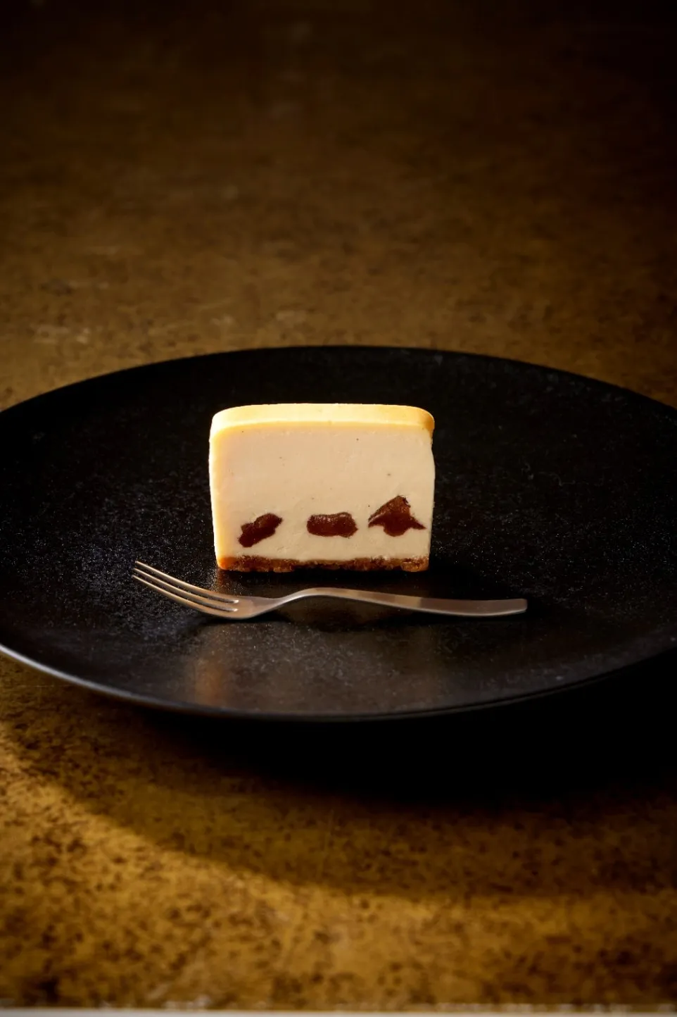 明治天皇に献上された「御前白柿」を貴醸梅酒に漬けて熟成させ、フランス産・デンマーク産チーズで仕立てた〈御菓子つちや〉の濃厚テリーヌ。