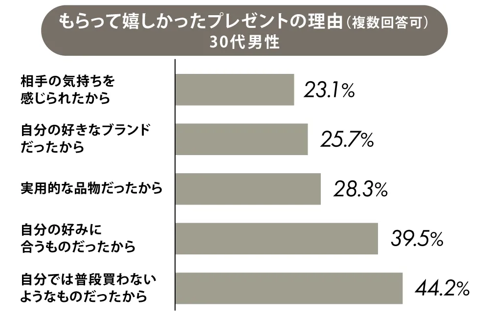 HYACCAが2026年に実施した独自アンケートでは、「好みに合う」(39.5%)「実用的」(28.3%)といった回答を抑え、「自分では普段買わないようなものだったから」(44.2%)が30代男性の1位に。