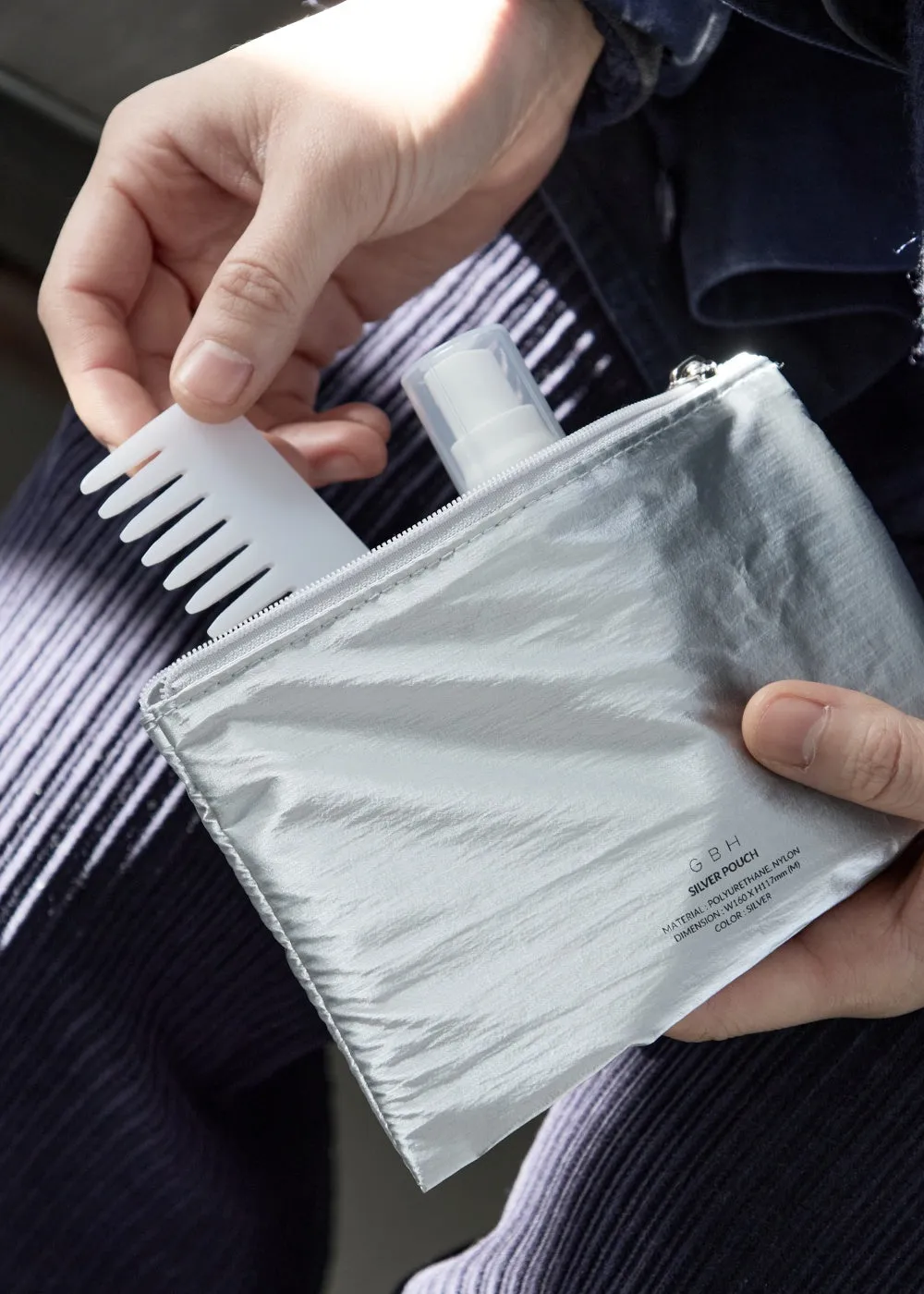 シルバーカラーのコーティング生地に〈GBH〉のロゴジッパーが映える、生活防水仕様のポーチ。 Sサイズはカードやイヤホン、Mサイズはコスメや文房具の収納にちょうどよい大きさです。 バッグの中をすっきり整えてくれるので、整理好きな友人に喜ばれます。