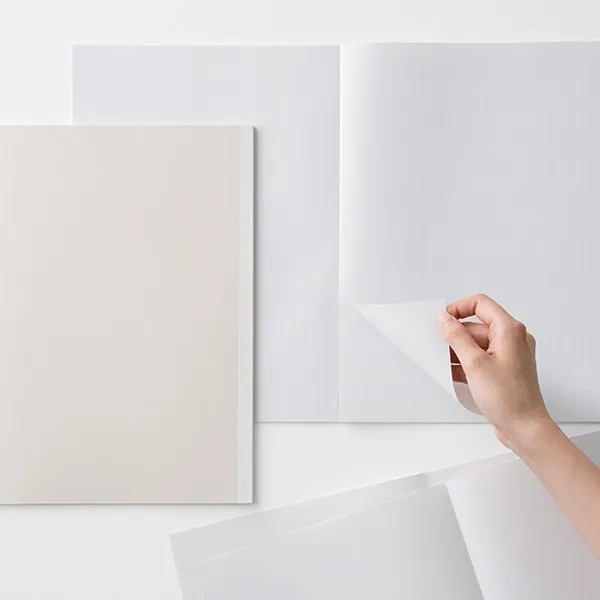 2つ折の紙が製本された「開きやすい」ノート。〈大成紙器製作所〉の特別な製本技術により、1枚剥がすとノートの倍のサイズの紙になるユニークな仕組み。思考をまとめたいとき、人と共有したいときに。文具好きな方へのさりげないプチギフトに。