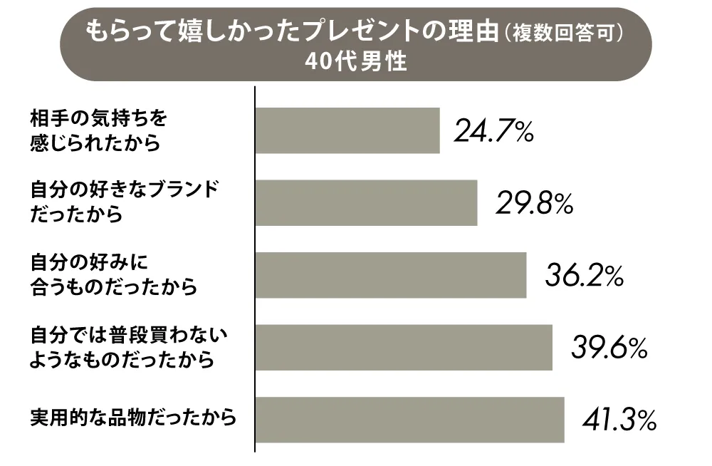 HYACCAが2026年に実施した独自アンケートによると、40代男性がもらって嬉しかった理由は以下のような結果になりました。