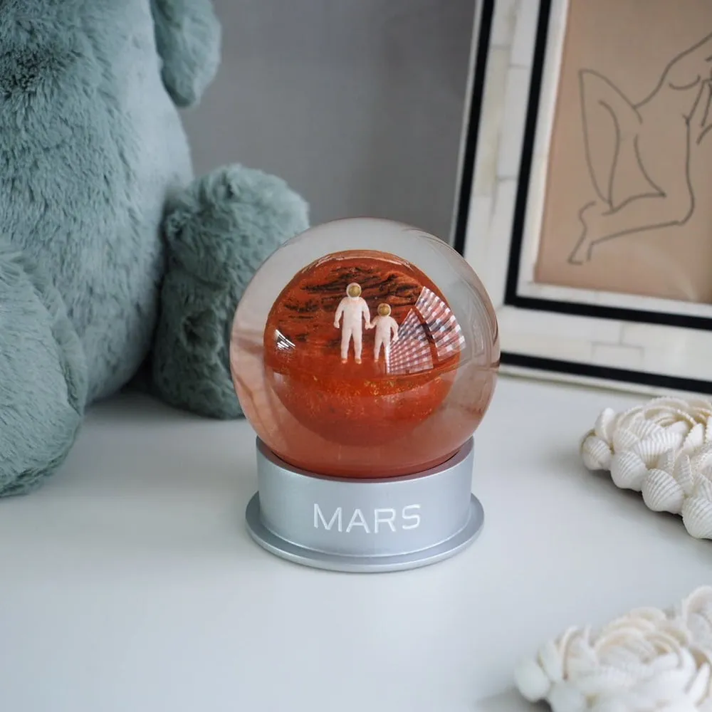 振るたびに火星の砂嵐が舞う、アメリカ・ポートランド発〈Humango Toys〉のスノードーム。 直径約10cmのガラスドームには、火星の断面とオリンポス山・マンネリス峡谷、そして手を繋ぐ親子の宇宙飛行士が作り込まれています。 デスクに置いて眺めるだけで、少しだけ遠くへ連れていってくれる絵画のような一品。 SFや宇宙が好きな20代の彼氏への、心をくすぐる誕生日ギフトに。