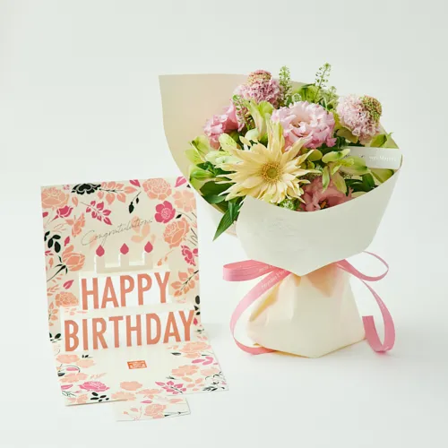 〈青山フラワーマーケット〉から、HAPPY BIRTHDAYのカードがポップアップする飛び出すフラワーギフト。 ピンクのカーネーションやスカビオサにペールイエローのガーベラが重なる、春のあたたかみあるブーケ仕立てです。 保水ゼリー入りで配送中も瑞々しく、ラッピングのまま手渡しできる安心の設計。 花を慈しむ母への、心温まる誕生日プレゼントに。