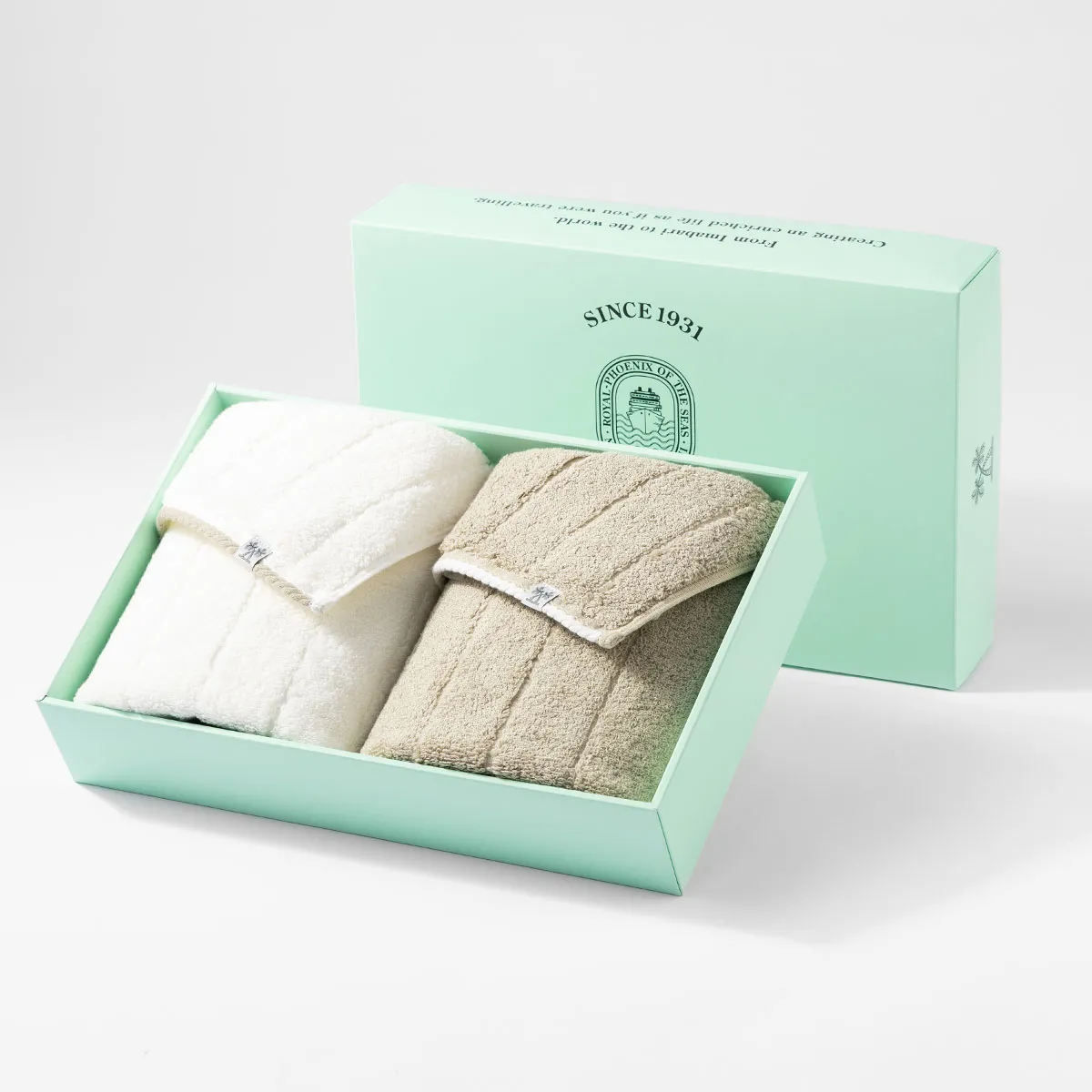 落ち着いた色味と紙質に、〈ロイヤル-フェニックス オブ ザ シーズ〉のロゴを配した、「AMBIENT TOWEL」シリーズ専用のギフトボックスでお届けします。
